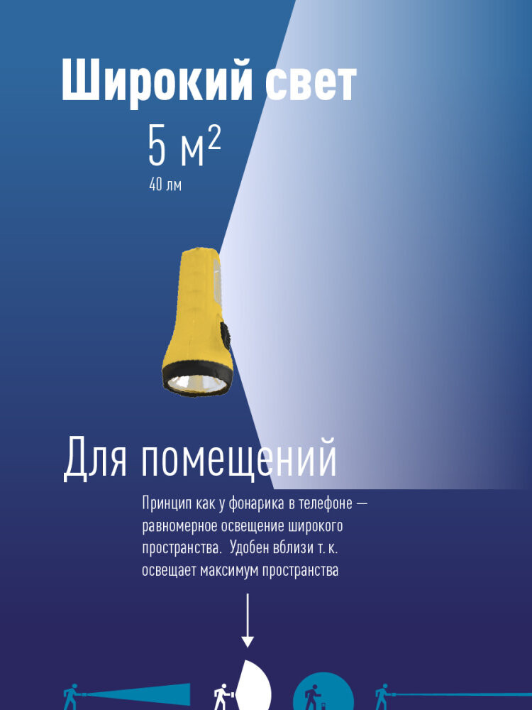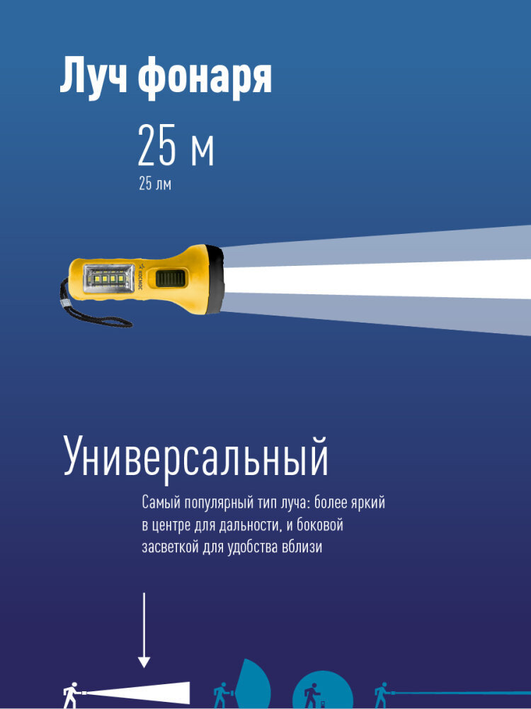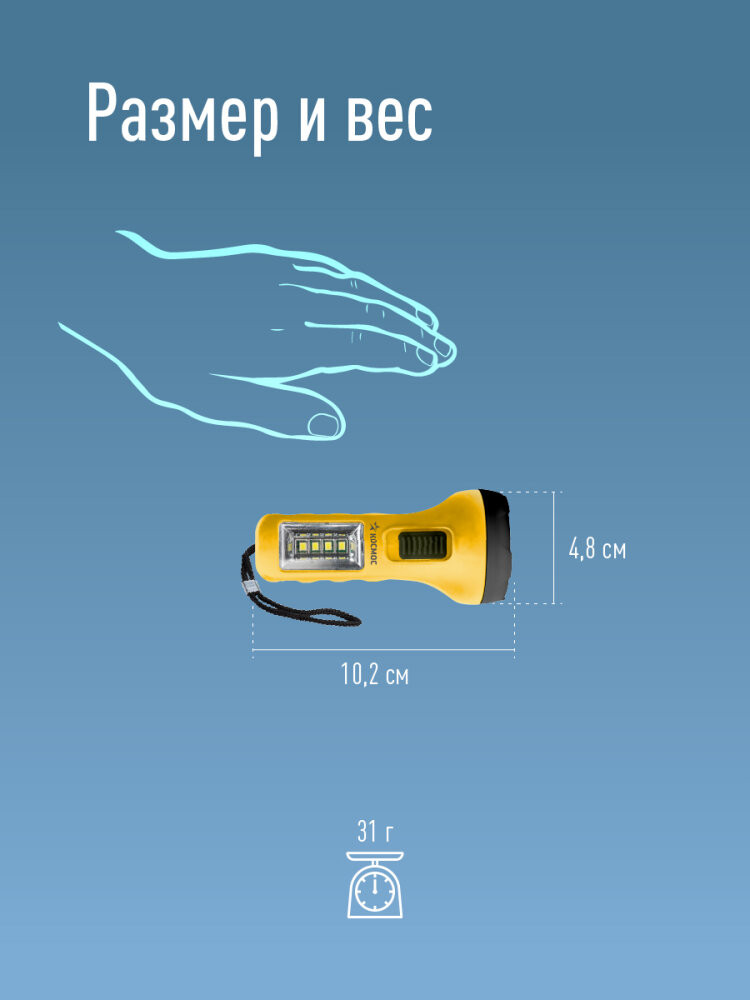 Фонарь ручной КОСМОС (KOC119B) 2в1 для рациональных – базовая конструкция без лишних функций, ценовой лидер в ярком желтом цвете. Совмещает луч фонаря (направленный свет) и широкий свет (освещает широкое пространство с одной стороны). Источник света - 1LED (0,5Вт). боковой светильник 4SMD LED(1Вт). Источник питания - 1xAA (в комплект не входит). Количество режимов - 2 (луч-боковой светильник). Световой поток - 25 лм. (луч)/40 лм. (широкий свет, боковой светильник). Дистанция освещения - 25 м. (луч)/5м2 (широкий свет, боковой светильник). Корпус - ABS-пластик, IP42. Компактный карманный размер - 10.2x4.85x4.85 см. Ремешок ручной.