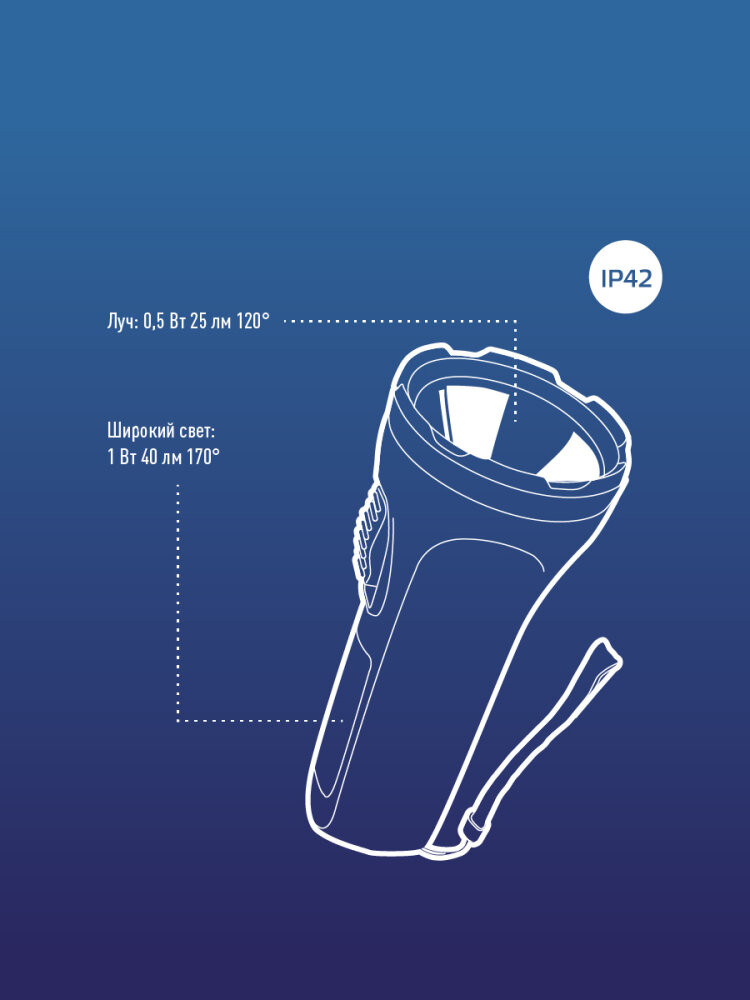 Полное описание товара Фонарь ручной 0,5Вт LED+4SMD1Вт, 1xAA, корпус ABS-пластик, ремешок ручной (Космос) KOC119B