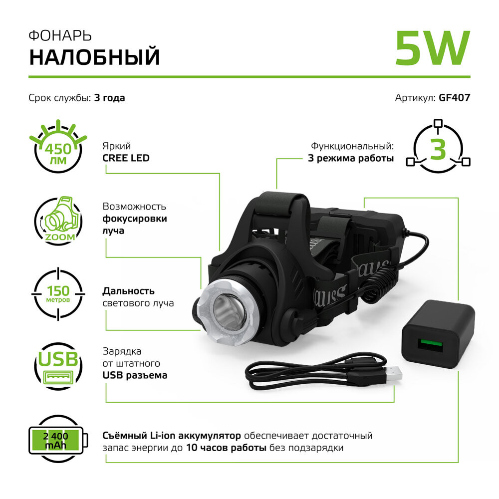 Полное описание товара Фонарь светодиодный налобный 5 Вт 450 лм Черный IP44 аккумуляторный Li-ion 2400мАч GFL Gauss (GAUSS) GF407