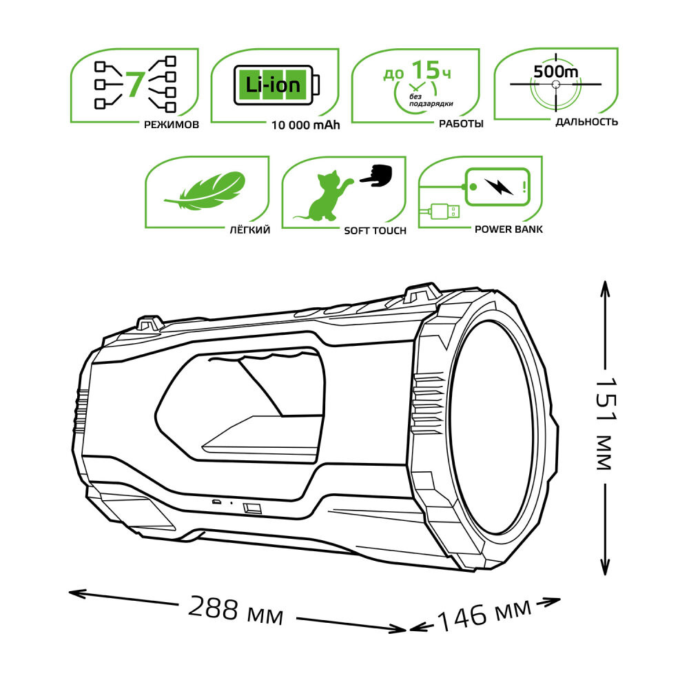 - Преимущества: Li-ion аккумулятор|Мощный яркий свет|Покрытие Soft-touch|Большое количество режимов|Большая дальность освещения|Power bank|Зарядка аккумулятора от розетки