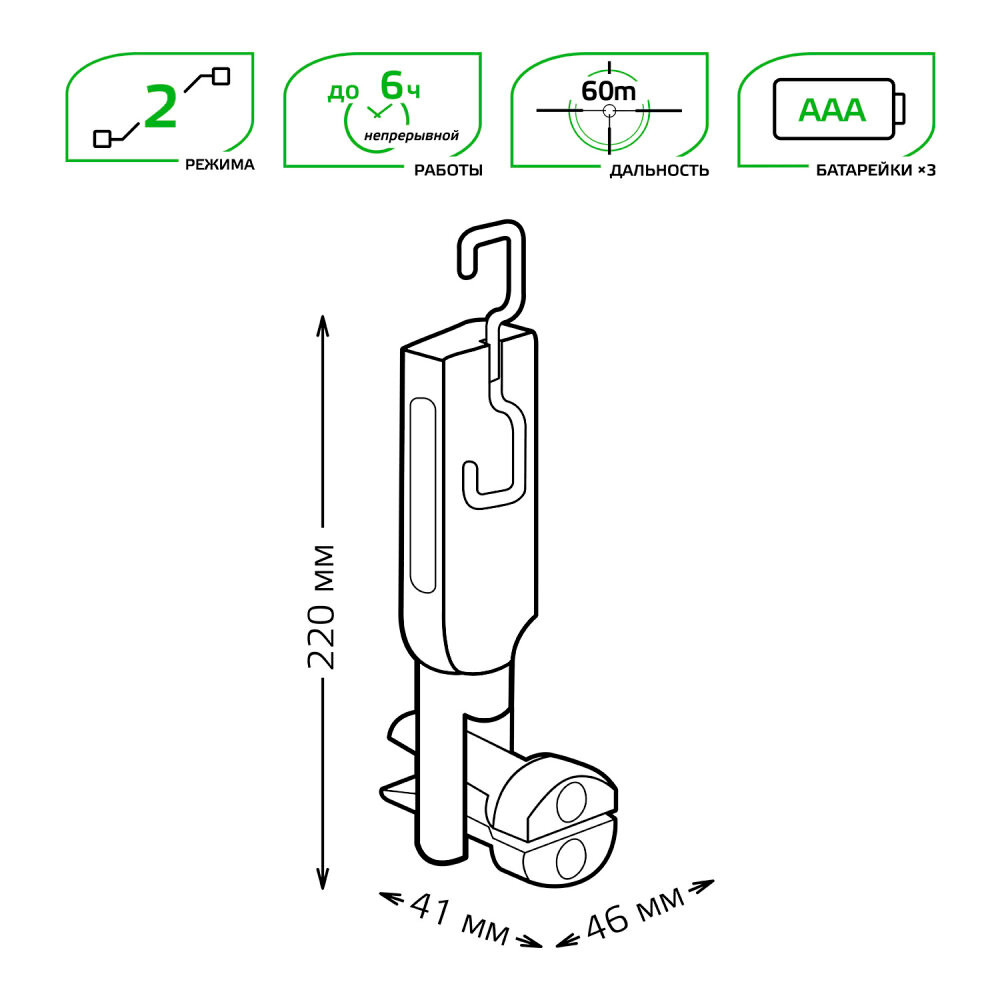 - Преимущества: Компактный размер|Магнитное крепление|Покрытие Soft-touch|Легкий вес|Длительная работа|Питание от батареек|Ударопрочный пластик