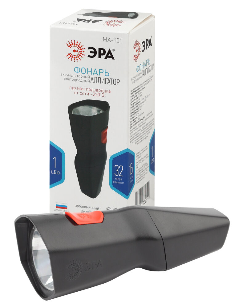 ЭРА MA-501 Аллигатор - удобный ручной фонарь собственной разработки ЭРА. Поставляется в презентабельной коробке, демонстрирующей необычный дизайн устройства. Эргономичный корпус имеет несколько граней. Фонарь отлично лежит в руке, яркая кнопка включения расположена прямо под большим пальцем. ЭРА МА-501 напрямую заряжается от электросети 220 В - не нужно брать с собой ни батарейки, ни провода для подзарядки. Вилка встроена прямо в корпус, достаточно просто снять с неё специальную защитную крышку и вставить фонарь в розетку. От одной подзарядки прибор проработает без перерыва 15 часов этого с запасом хватит на целую ночь или многодневное путешествие, если включать фонарь на несколько часов по вечерам.