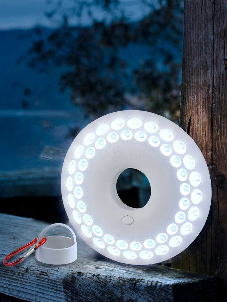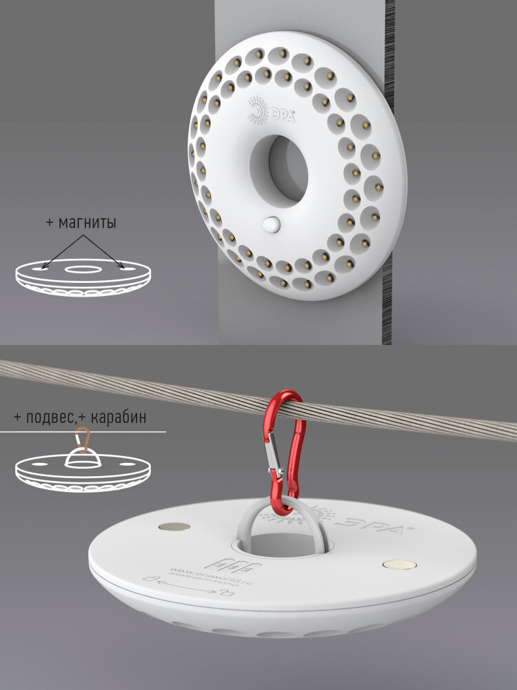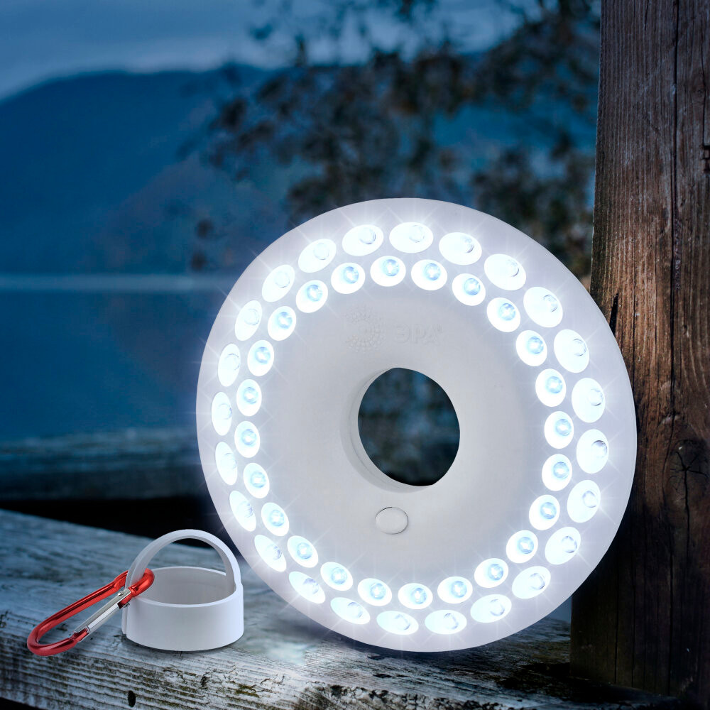Светодиодный кемпинговый фонарь в футуристичном дизайне, специально разработанном компанией ЭРА. Фонарь предназначен для активного отдыха, отдыха на природе, для пикников, дачи. Дизайн фонаря функционален. 48 мощных светодиодов расположены по кругу таким образом, чтобы освещать максимально большую площадь ярким белым. Светодиоды энергоэкономичны, не перегорают и не требуют замены. Посередине фонаря предусмотрено отверстие, если надеть фонарь на любую подставку, например, на бутылку, получится настольный светильник. Фонарь оснащен мощным магнитом, так что его легко приклеить к металлической поверхности. Корпус выполнен из ударопрочного пластика и защищает от царапин и механических повреждений, а светодиоды встроены внутрь корпуса, что обеспечивает им дополнительную защиту. Дальность луча фонаря составляет 21 метр, мощность - 3,3Вт.
