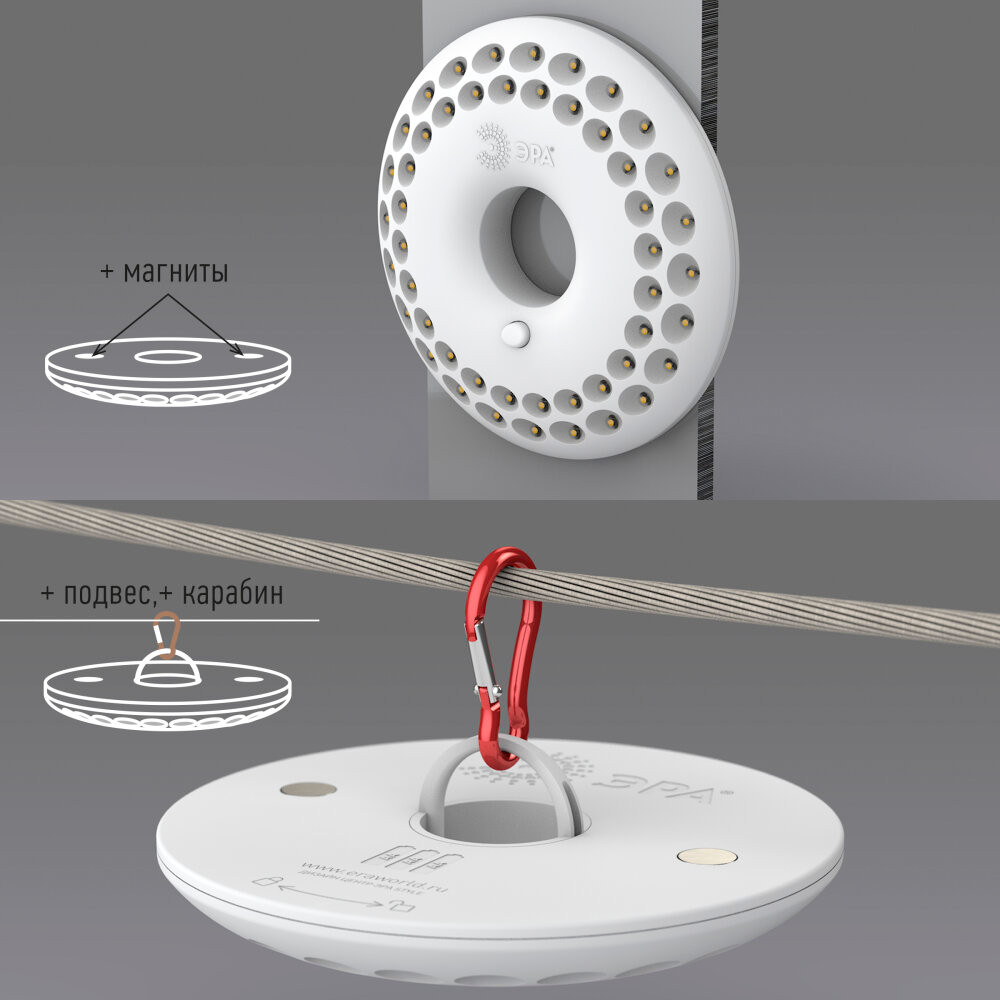 Полное описание товара Фонарик светильник подвесной на батарейках 3хAA, подвес, карабин, магнитный в палатку, 48 LED KB-601 НЛО-48 (ЭРА) Б0029178