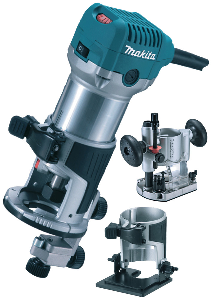 Полное описание товара Фрезер кромочный 710Вт, 10000-30000об/м, цанга 6-8мм, сменные платформы, сумка (Makita) RT0700CX2