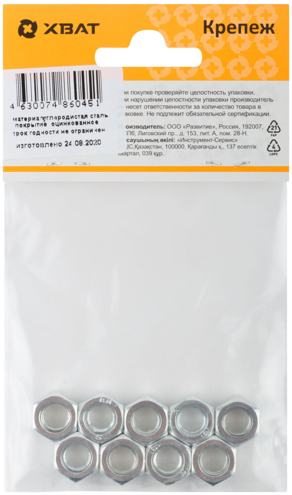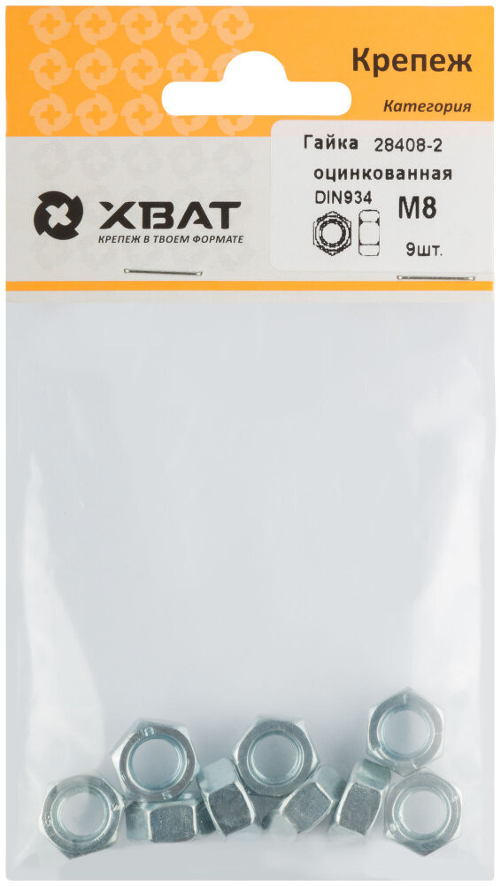 Гайка DIN934 М8 шестигранная оцинкованная (9 шт) (ХВАТ) 28408-2