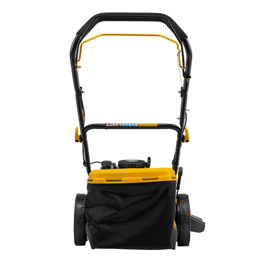 - Преимущества: Быстрый старт - насос подкачки топлива (праймер) позволяет легко запустить двигатель даже после долгого простоя|Комбинированный травосборник на 65 л - сочетание пластика и мягкой ткани делает его легким и простым в уходе, трава в нем не перегнивает|Контроль заполненности травосборника - флажок указывает, когда нужно опустошить контейнер|Защита двигателя от поломки - воздушный фильтр предотвращает попадание твердых частиц в цилиндр|Комфортная и безопасная работа - на рукоятке предусмотрено виброгасящее покрытие|Широкие колеса Eco-friendly - газонокосилка легко проходит по газону, не повреждая его|Простое обслуживание - функция быстрой очистки Quick clean значительно упрощает удаление травы и грязи|Легкая подготовка к хранению - быстрозажимные эксцентриковые фиксаторы позволяют быстро сложить рукоятку без использования инструмента|