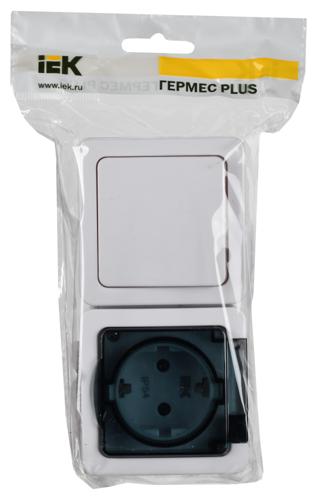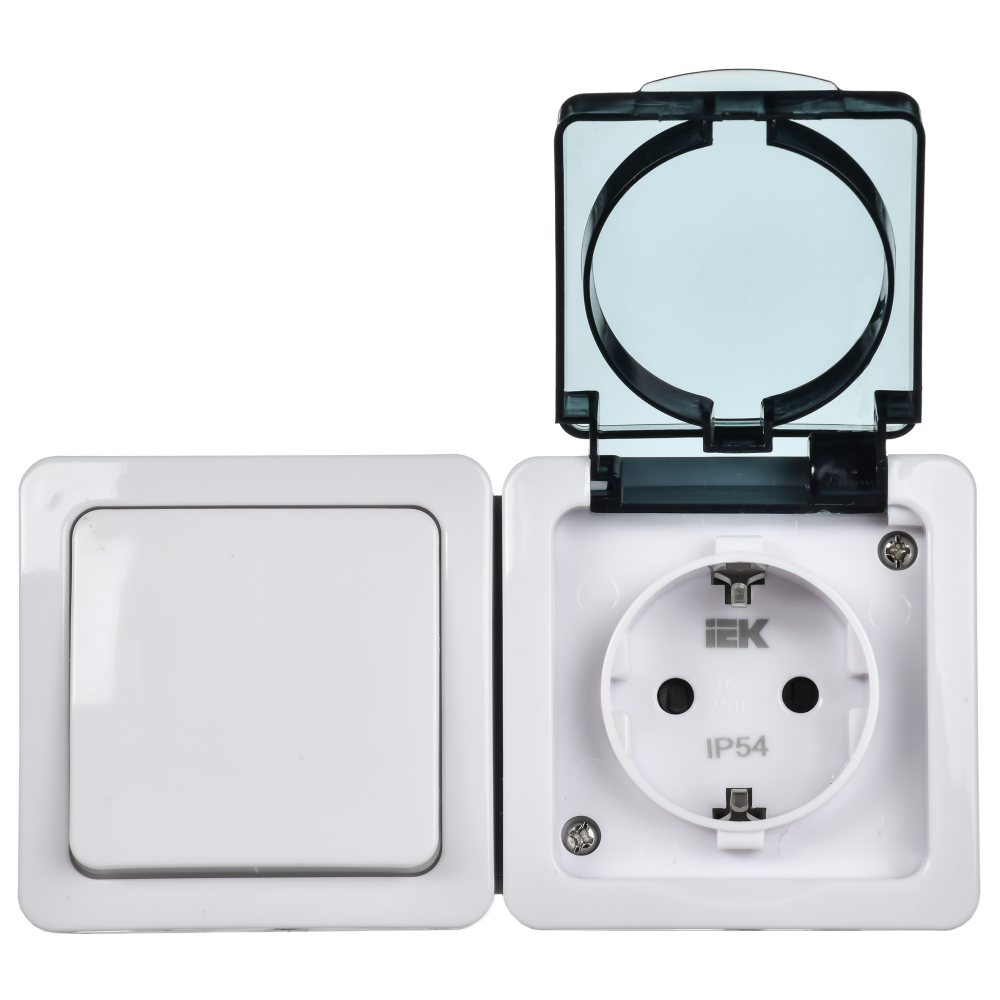 Полное описание товара Гермес PLUS Блок наружный: выключатель одноклавишный и розетка с заземлением IP54 (IEK) EBGMP20-K03-31-54-EC