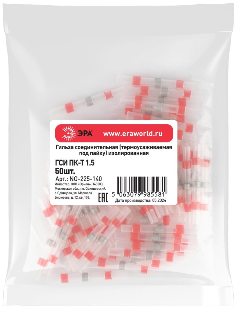 Полное описание товара Гильза соединительная термоусаживаемая ГСИ ПК-Т 1.5 изолированная под пайку (упаковка 50 шт.) NO-225-140 (ЭРА) Б0063404
