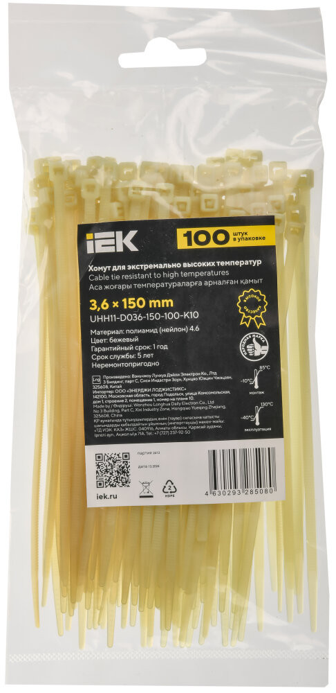 Полное описание товара Хомут P4.6 для экстремально высоких температур бежевый 3.6х150мм 100шт/упак IEK (IEK) UHH11-D036-150-100-K10