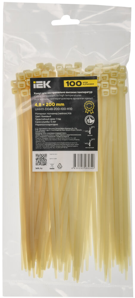 Полное описание товара Хомут P4.6 для экстремально высоких температур бежевый 4.8х200мм 100шт/упак IEK (IEK) UHH11-D048-200-100-K10