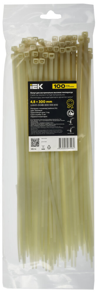 Полное описание товара Хомут P4.6 для экстремально высоких температур бежевый 4.8х300мм 100шт/упак IEK (IEK) UHH11-D048-300-100-K10