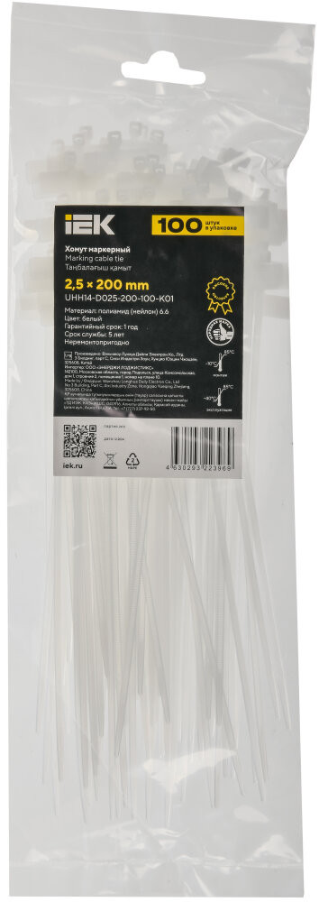 Полное описание товара Хомут P6.6 маркерный белый 2.5х200мм 100шт/упак IEK (IEK) UHH14-D025-200-100-K01