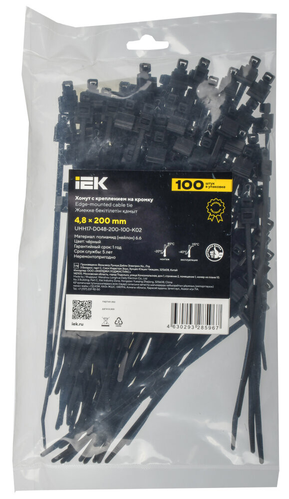 Полное описание товара Хомут P6.6 с креплением на кромку черный 4.8х200мм 100шт/упак IEK (IEK) UHH17-D048-200-100-K02