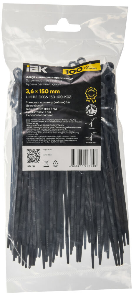 Полное описание товара Хомут P6.6 с винтовым креплением черный 3.6х150мм 100шт/упак IEK (IEK) UHH12-D036-150-100-K02