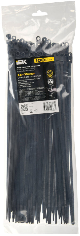 Полное описание товара Хомут P6.6 с винтовым креплением черный 4.8х300мм 100шт/упак IEK (IEK) UHH12-D048-300-100-K02
