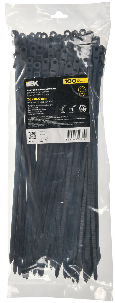 Полное описание товара Хомут P6.6 с винтовым креплением черный 7.6х400мм 100шт/упак IEK (IEK) UHH12-D076-400-100-K02