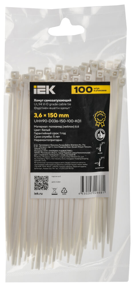 Полное описание товара Хомут P6.6 самозатухающий белый 3.6х150мм 100шт/упак IEK (IEK) UHH90-D036-150-100-K01