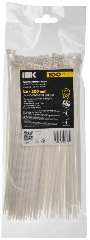 Хомут P6.6 самозатухающий белый 3.6х200мм 100шт/упак IEK (IEK) UHH90-D036-200-100-K01