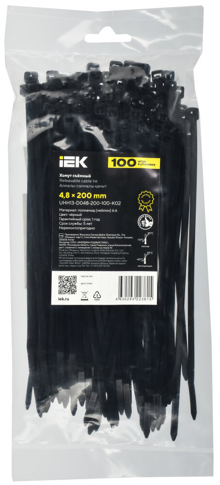 Полное описание товара Хомут P6.6 съемный черный 4.8х200мм 100шт/упак IEK (IEK) UHH13-D048-200-100-K02