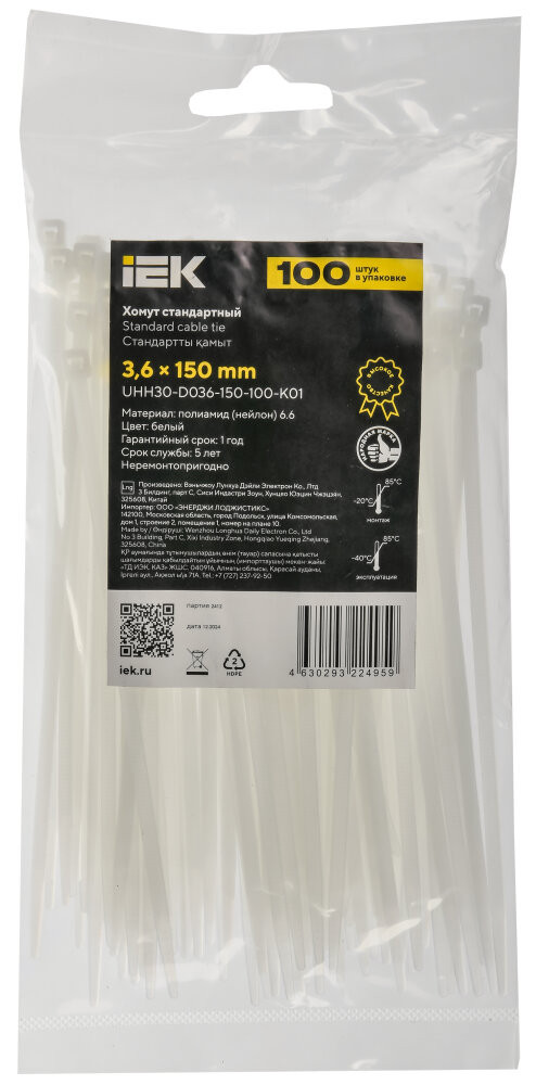 Полное описание товара Хомут P6.6 стандартный белый 3.6х150мм 100шт/упак IEK (IEK) UHH30-D036-150-100-K01