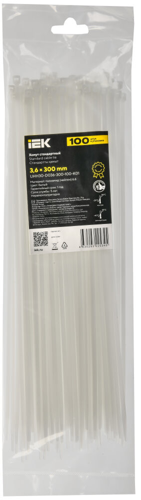 Полное описание товара Хомут P6.6 стандартный белый 3.6х300мм 100шт/упак IEK (IEK) UHH30-D036-300-100-K01