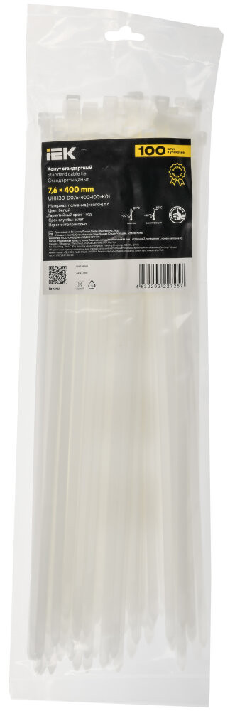 Полное описание товара Хомут P6.6 стандартный белый 7.6х400мм 100шт/упак IEK (IEK) UHH30-D076-400-100-K01
