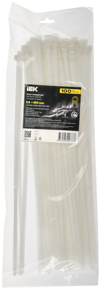 Полное описание товара Хомут P6.6 стандартный белый 8.8х450мм 100шт/упак IEK (IEK) UHH30-D088-450-100-K01