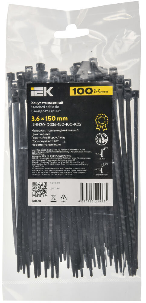 Полное описание товара Хомут P6.6 стандартный черный 3.6х150мм 100шт/упак IEK (IEK) UHH30-D036-150-100-K02