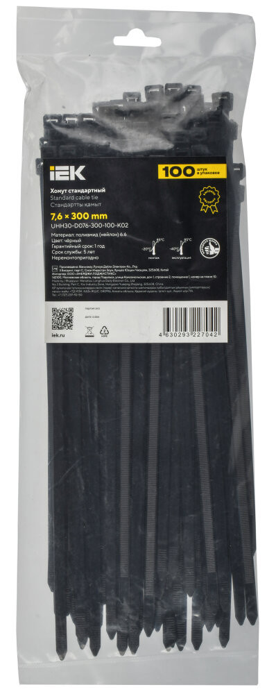 Полное описание товара Хомут P6.6 стандартный черный 7.6х300мм 100шт/упак IEK (IEK) UHH30-D076-300-100-K02