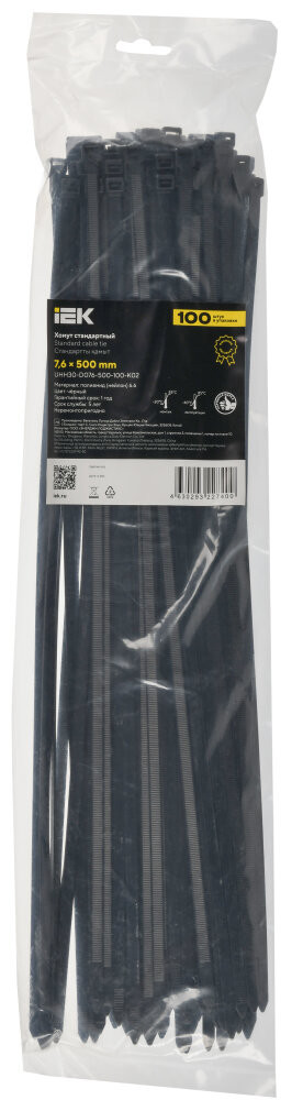 Полное описание товара Хомут P6.6 стандартный черный 7.6х500мм 100шт/упак IEK (IEK) UHH30-D076-500-100-K02