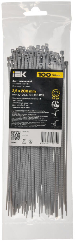Полное описание товара Хомут P6.6 стандартный серый 2.5х200мм 100шт/упак IEK (IEK) UHH30-D025-200-100-K03