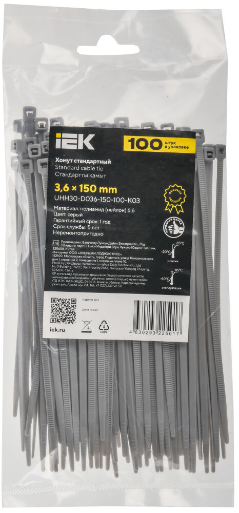 Полное описание товара Хомут P6.6 стандартный серый 3.6х150мм 100шт/упак IEK (IEK) UHH30-D036-150-100-K03