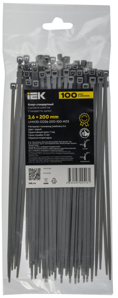 Полное описание товара Хомут P6.6 стандартный серый 3.6х200мм 100шт/упак IEK (IEK) UHH30-D036-200-100-K03
