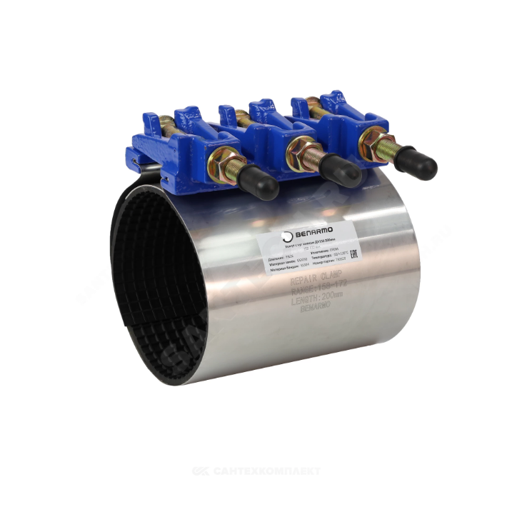 Полное описание товара Хомут ремонтный нержавеющий Ду80 (88-98)мм L=200 с чугунным замком (Benarmo) 013-2857