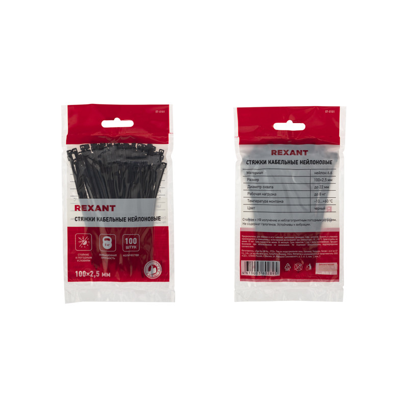 Полное описание товара Хомут-стяжка кабельная нейлоновая 100x2,5 мм, черная, 100 шт (REXANT) 07-0101