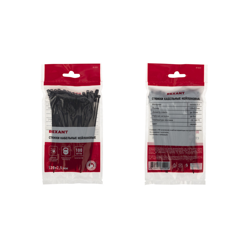 Полное описание товара Хомут-стяжка кабельная нейлоновая 120x2,5 мм, черная, упаковка 100 шт, REXANT (REXANT) 07-0121