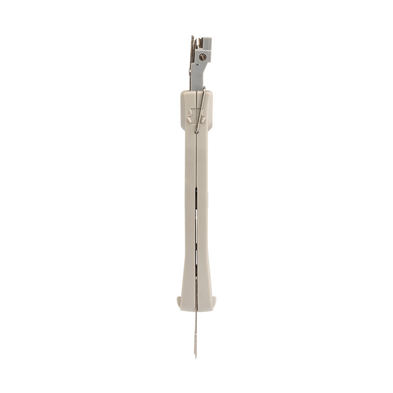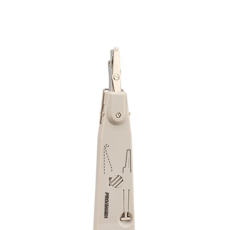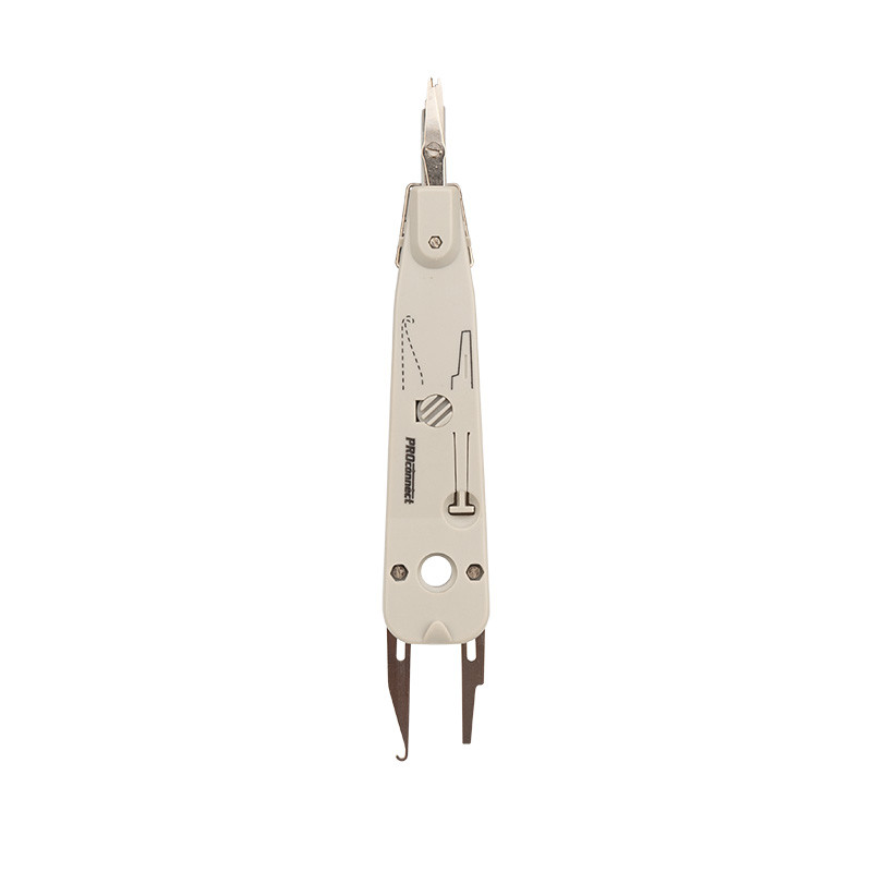 Инструмент предназначен для заделки и обрезки проводников во врезные контакты на кроссах, патч-панелях, розетках и модулях, для заделки контактов 110-го типа и типа KRONE. Корпус инструмента изготовлен из ударопрочного пластика, рабочие части выполнены из высокопрочной инструментальной стали. Инструмент оснащен ножницами для автоматического отрезания излишка кабеля при заделке контакта и крючками для извлечения кабеля из разъема. Крючки извлекаются из корпуса с помощью специального рычага. Пластиковая рукоятка благодаря специальной форме удобно лежит в руке и обеспечивает легкую и приятную работу с инструментом.