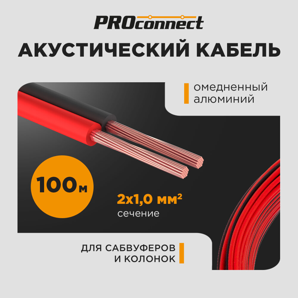 Акустический кабель - отличное решение для всех аудиолюбителей. Качество звучания аудиосистемы зависит не только от воспроизводящей аппаратуры и колонок, но и от акустического кабеля, соединяющего все элементы этой системы. Доступная цена и высокое качество материалов является главным плюсом торговой марки PROconnect. Кабель акустический 2х1,00 кв.мм PROconnect состоит из двух параллельных многожильных проводников в изоляции из поливинилхлоридного пластиката красного и черного цвета. Разделительное основание позволяет обеспечить разделение проводников кабеля без повреждения изоляции и оголения жил.