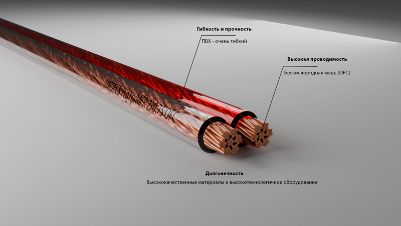 Кабель с бескислородной медью предназначен для подключения усилителей мощности к акустическим системам. Он имеет изоляцию из ПВХ и плоскую форму с одной красной жилой. Бескислородная медь обеспечивает высокую проводимость и чистоту из-за процесса электролитического рафинирования. Бескислородная медь содержит 99,99% меди и рекомендуется для применения там, где требуются высокая проводимость и надежность. Кабели с бескислородной медью обеспечивают исключительные аудио характеристики благодаря чистой и точной передаче аудиосигналов.