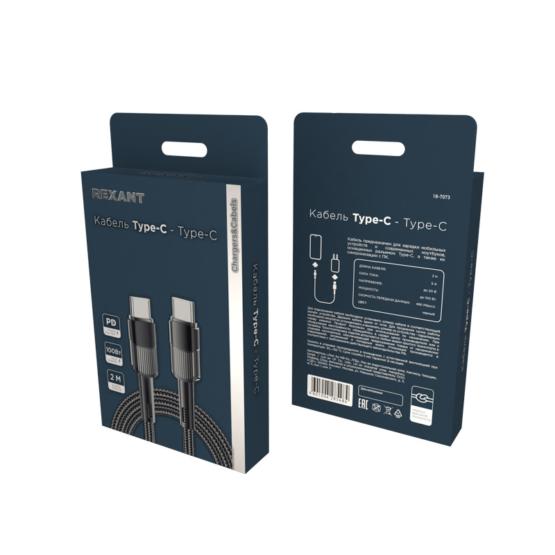 Полное описание товара Кабель USB Type-C - Type-C, 5A, 100Вт, 2м, черный (REXANT) 18-7073