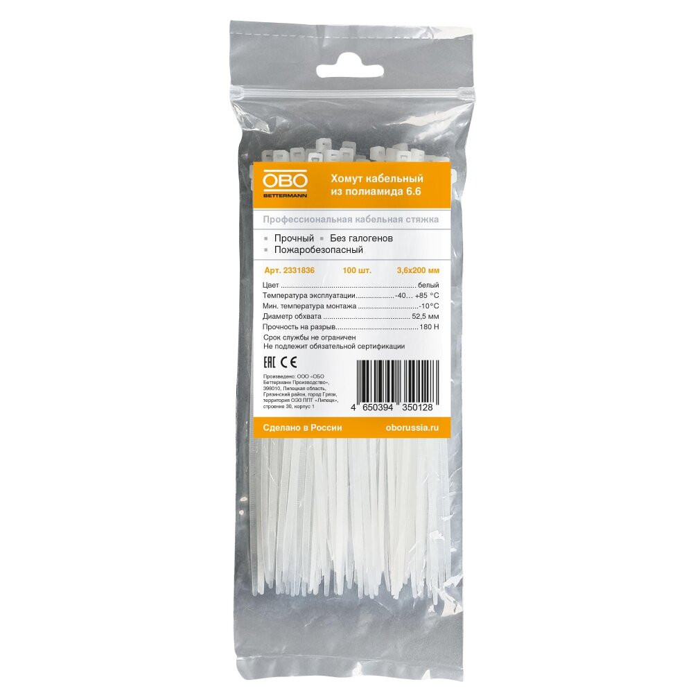 Полное описание товара Кабельная стяжка белая 3,6x200 мм (OBO Bettermann) 2331836