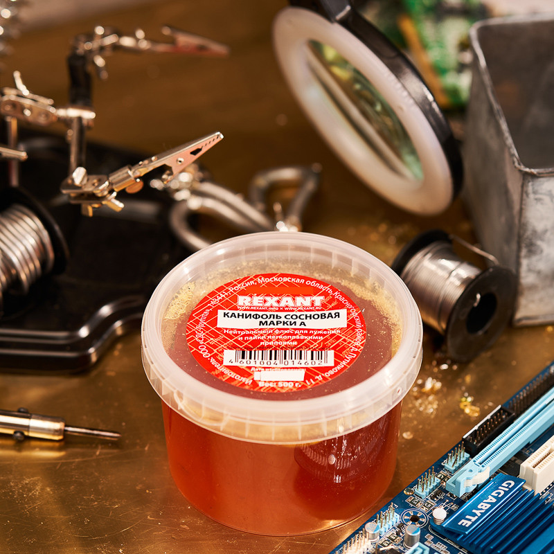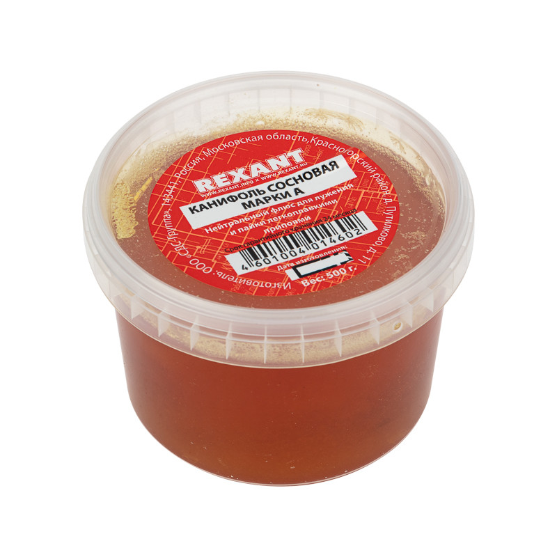 Канифоль сосновая марки А 500 г REXANT предназначена для удаления тонких и нестойких оксидов с поверхности под пайку, улучшения растекания жидкого припоя при пайке печатных плат и радиокомпонентов. Канифоль — хрупкое, стекловидное вещество темно-красного или светло-желтого цвета, применяется в качестве нейтрального флюса при пайке и лужении деталей или поверхностей припоями оловянно-свинцовой группы. Она входит в состав смол хвойных деревьев и получается из живицы. После пайки смывка не требуется. Тип - флюс нейтральный. Масса нетто - 500 г. Меры предосторожности - хранить в местах, недоступных для детей.
