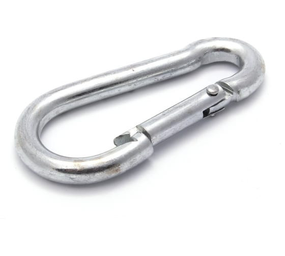 Пожарный карабин изготовлен из прутковой оцинкованной стали и имеет несложную конструкцию. У продолговатого изделия в форме неправильного овала есть подпружиненная защелка, вращающаяся на оси, с замком. Такая быстроразъемная деталь делает возможным ускоренную фиксацию тросов, веревок или цепей, их соединение между собой либо отсоединение.