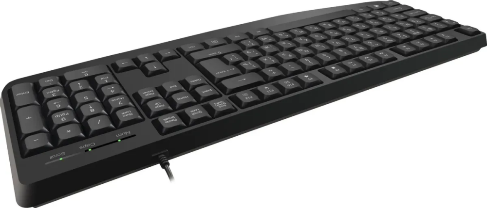 Удобная и стильная проводная офисная клавиатура со встроенной подставкой для запястий. У данной модели предусмотрены резиновые накладки для предотвращения скольжения по поверхности стола, классическая раскладка и горячие клавиши для управления мультимедийными программами.