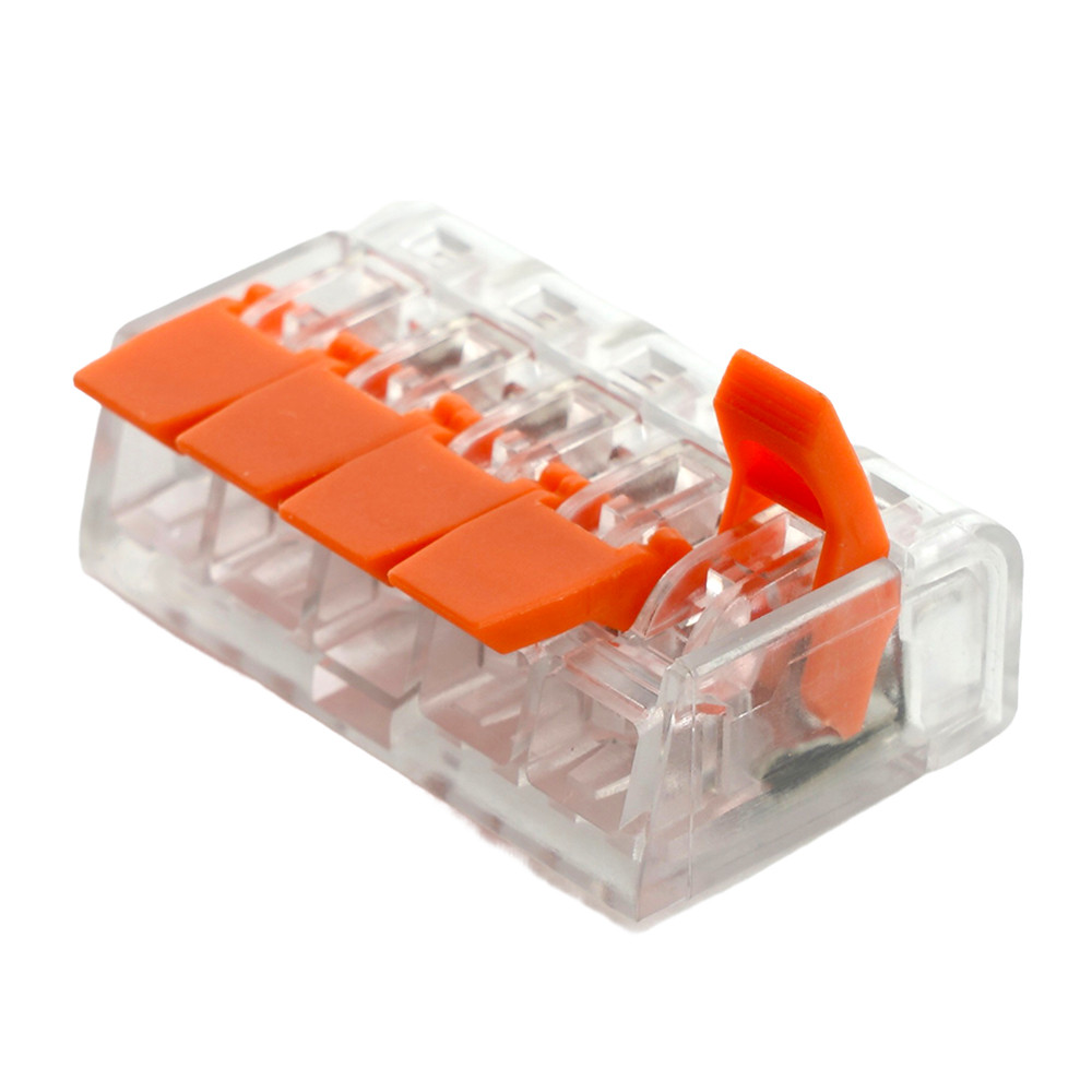 Клемма пружинная универсальная компактная STEKKER LD221-415, 5-проводная (сечение одножильного/многожильного проводников) 0,14 - 4мм2, 450В, максимальный ток 32А, без пасты, материал изделия поликарбонат, латунь. Тип провода одножильный/многожильный, материал присоединяемого проводника - медь, температура окружающей среды -20 - +40 градусов C. Клеммы серии 221 удобны тем, что конструкция позволяет визуально проверить контакт без лишних трудностей, т.к. зажимы имеют прозрачный корпус.