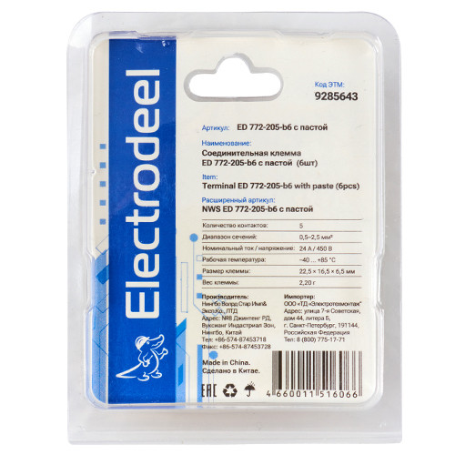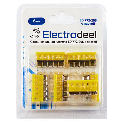 Клемма соединительная 5-контактная с пастой Elеctrodeel ED 772-205-b6, сечение 0,5-2,5 мм2, 24А/450В (упаковка 6 штук) (Electrodeel) ED 772-205-b6 с пастой