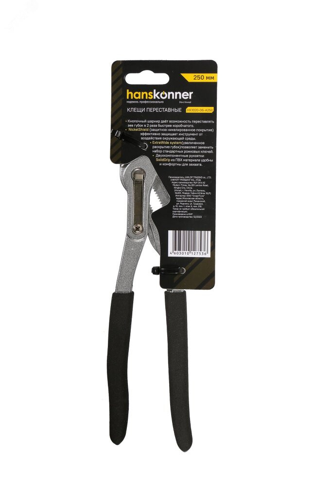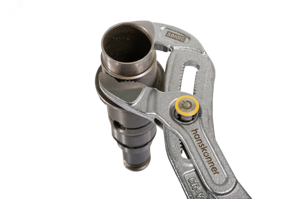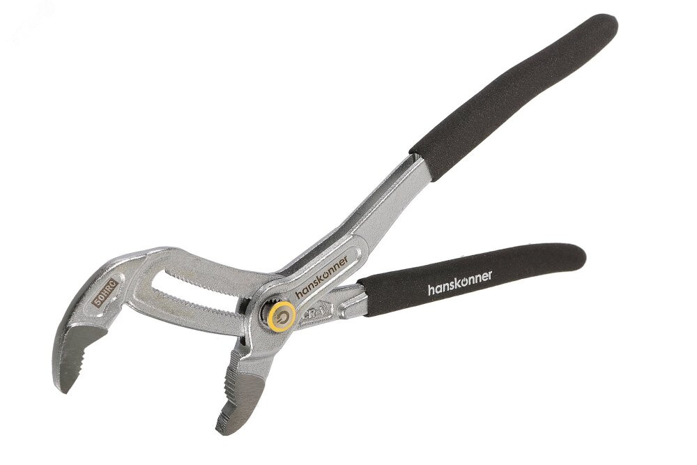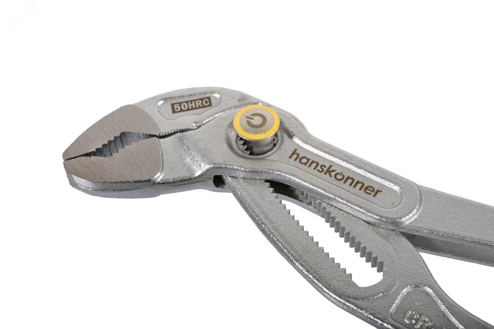 Полное описание товара Клещи переставные 250мм с кнопочным шарниром CrV раскрытие губ. 50мм(>43%) (Hanskonner) HK1020-06-A250