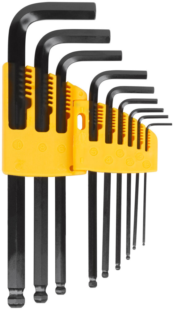 Набор шестигранных ключей FIT IT в складном пластиковом держателе предназначен для закручивания и откручивания крепежа с внутренним шестигранником при проведении ремонтных работ. Шаровые наконечники ключей позволяют работать в труднодоступных местах под углом до 35 градусов. Ключи изготовлены из хром-ванадиевой стали, отличаются прочностью и износостойкостью. Обеспечивают высокий крутящий момент. 9 ключей в комплекте обеспечивают широкий спектр применения.