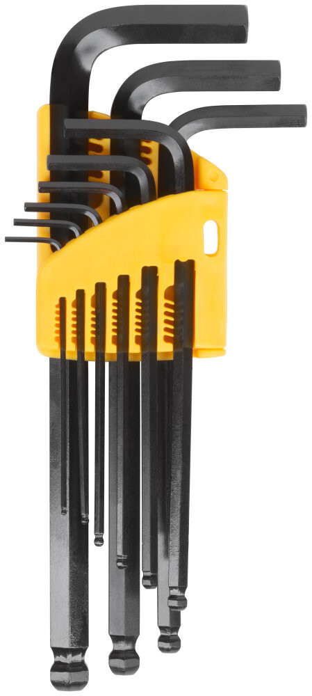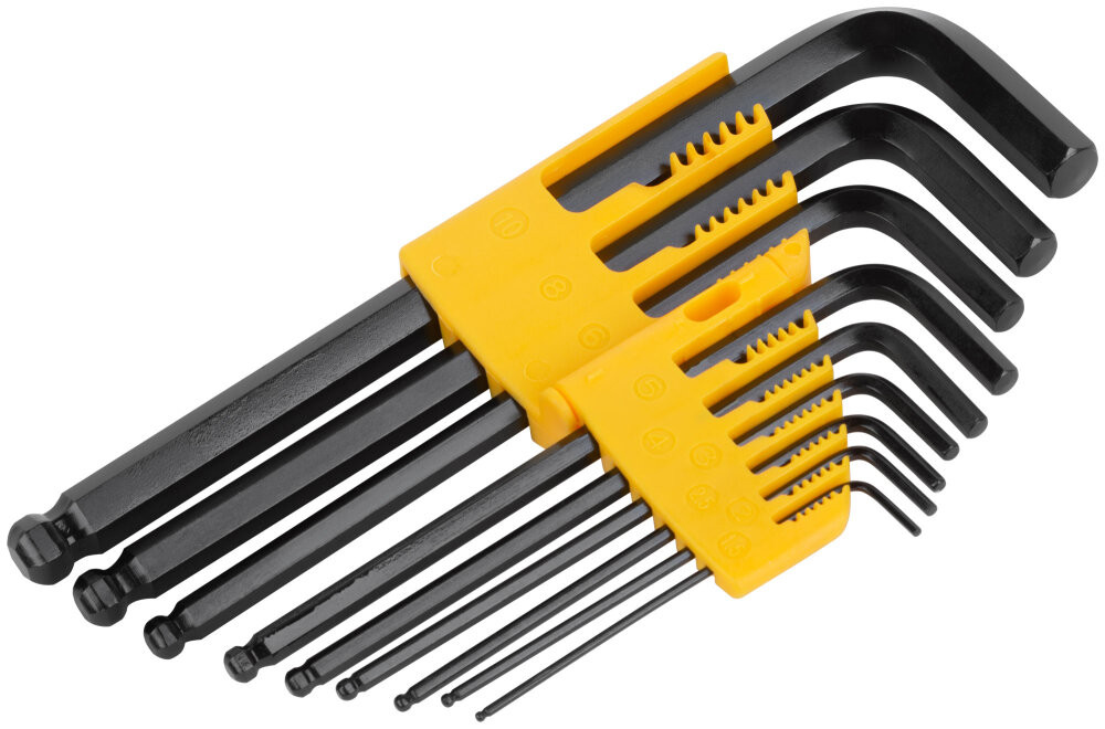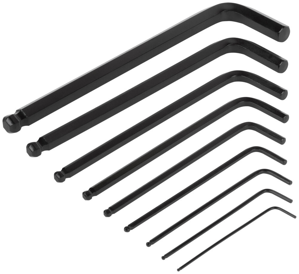 - Преимущества: Изготовлены из хром-ванадиевой стали и устойчивы к интенсивным нагрузкам|Закалка ключей обеспечивает высокую твердость и прочность|Увеличенная длина ключей позволяет передавать большее усилие во время работы|Шаровый наконечник обеспечивает возможность работы в труднодоступных местах|9 размеров в наборе способствуют выполнению широкого спектра задач|Хромированное покрытие ключей предотвращает коррозию|Эргономичный складной пластиковый футляр обеспечивает организованное хранение и транспортировку